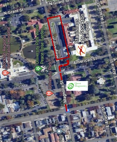 Wellness WORKs! is located in CSU Stanislaus Stockton Campus at University Park, north of downtown Stockton. Our address is 612 East Magnolia Street. There is a stoplight at the California and Magnolia intersection. If you enter University Park at the intersection of California and Magnolia, continue down Magnolia until you come to the first 4-way stop. Make a right into the second opening which is American St. Make an immediate left into the parking lot. Red rectangle indicates the parking lot closest to the entrance.